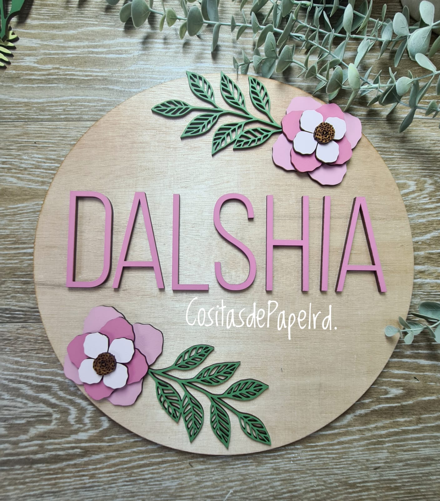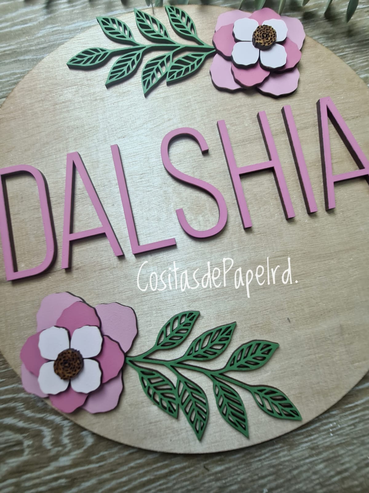 Cartel decorativo hecho en MDF natural, con nombre en relieve cortado en láser y flores pintadas a mano.